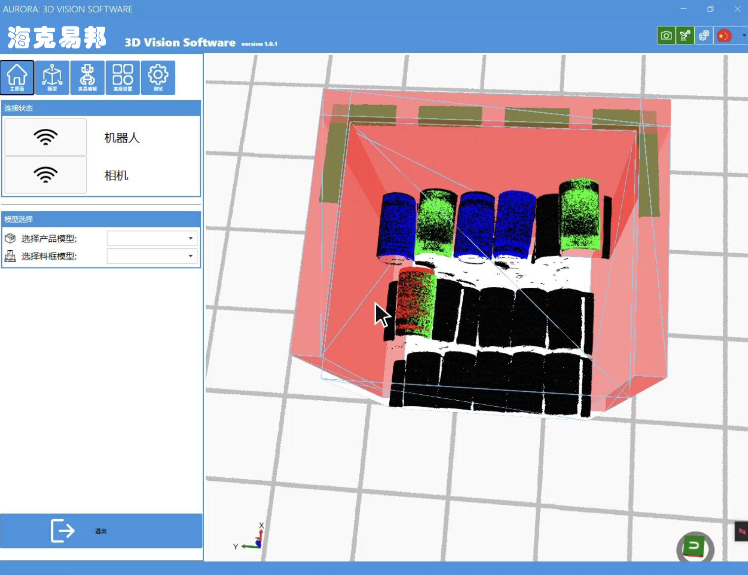 毛刺套3D視覺系統(tǒng)定位系統(tǒng)采用3D結(jié)構(gòu)光相機(jī)實(shí)時(shí)定位缸套姿態(tài),然后控制機(jī)器人將缸套從料框中抓取到產(chǎn)線上進(jìn)行加工。該系統(tǒng)可以根據(jù)周邊設(shè)備干涉及產(chǎn)品姿態(tài)實(shí)現(xiàn)自動(dòng)避障, 選擇時(shí)間最短或距離最優(yōu)的路徑,自動(dòng)規(guī)劃抓取以及從料框退出的軌跡。